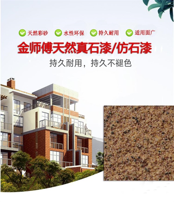 金師傅仿石藝術(shù)漆系列包含有御石漆、水包砂仿石漆、水包水仿石漆和天然真石漆等,具有水性環(huán)保、持久耐用、無毒無味、裝飾效果好、成本低、使用周期長等特點(diǎn),是外墻裝飾的明智選擇。