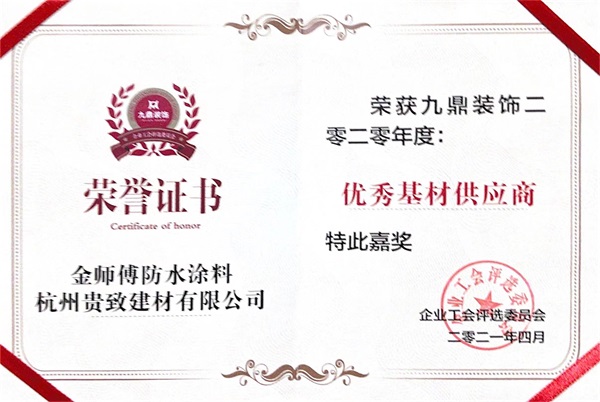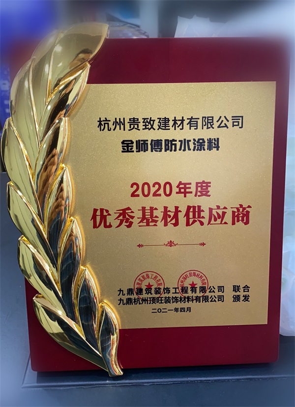 喜訊傳來——作為與九鼎裝飾合作多年的金師傅防水涂料,憑借優(yōu)質(zhì)的配套服務(wù)和穩(wěn)定的產(chǎn)品性能在眾多供應(yīng)商中脫穎而出,喜獲“2020年度優(yōu)秀基材供應(yīng)商”榮譽(yù)稱號!