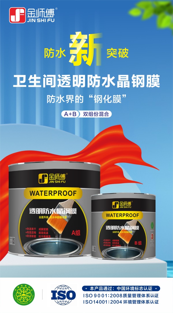 金師傅透明防水晶鋼膜是一款透明隱形防水,不影響美觀,還防滑易擦洗,解決普通防水膠時間長發(fā)黃、施工后遇水起皮脫殼、施工不凝固等問題。