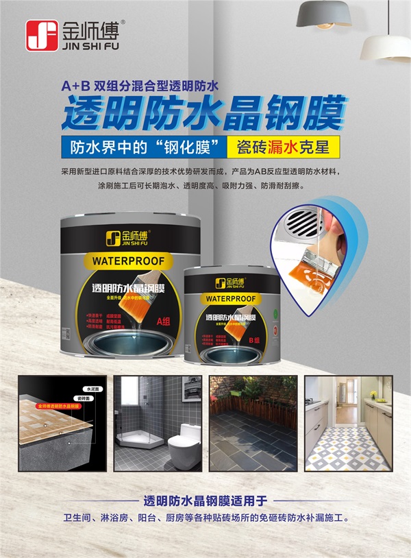 金師傅透明防水晶鋼膜采用新型進口原料結(jié)合深厚的技術(shù)優(yōu)勢研發(fā)而成,產(chǎn)品為AB反應(yīng)型防水材料,被廣泛應(yīng)用于衛(wèi)生間、陽臺、浴室等各種貼磚場所的免砸磚防水補漏施工。