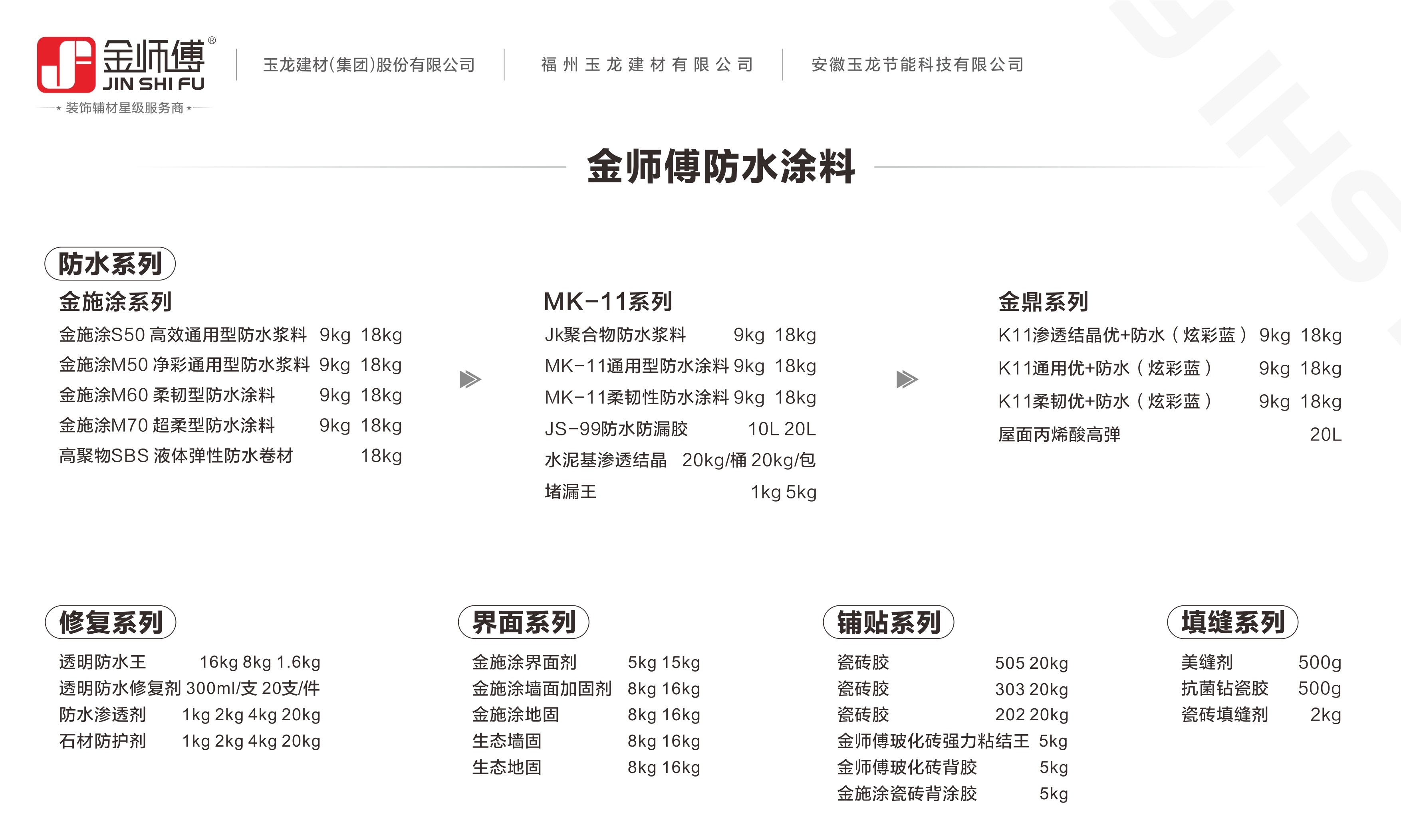 市面上防水材料大多太雜,每個(gè)材料廠家都有自己的名稱以及產(chǎn)品編號(hào),和石材、金屬等一樣,很容易把用戶給繞暈,迷迷糊糊不知道怎么選擇材料,不知道什么場(chǎng)合適用什么材料。那么這次,來(lái)帶你輕松了解玉龍建材金師傅關(guān)于防水這一塊的產(chǎn)品體系。
